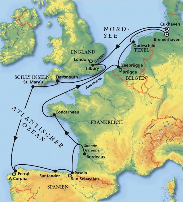 Zur besten sommerlichen Reisezeit kommen Sie an Bord Ihrer MS Deutschland und bereisen den pittoresken britischen Süden, den grünen Norden Spaniens, die charmante nordfranzösische Küste sowie die beliebte Bade- und Urlaubsregionen unserer belgischen und niederländischen Nachbarn.