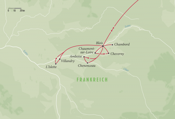 Sie fahren südwestlich nach Chaumont-sur-Loire und besuchen das Schloss, welches hoch über der Loire liegt. Ihm angeschlossen ist das Internationale Gartenfestival. Bevor Sie zurück nach Blois zu Abendessen und Übernachtung fahren, besuchen Sie noch das Schloss Cheverny.