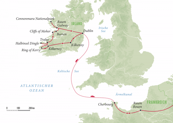Der Bus ist am Hafen von Cherbourg angekommen. Gegen 16.30 Uhr heißt es „Leinen los!“ und das Fährschiff von Irish Ferries nimmt Kurs auf Irland. Genießen Sie ein leckeres Abendessen im Restaurant oder einen Drink an der Bar bevor Sie sich in die Kissen fallen lassen und dem neuen Tag entgegen träumen.